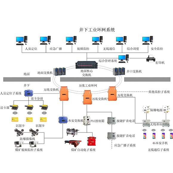 為解決這一問題,山東新云鵬結(jié)合山西省煤礦智能化建設(shè)實施意見要求,在地面機(jī)房安裝2臺核心匯聚萬兆交換機(jī),井下中央變電所、采區(qū)變電所等固定硐室安裝5臺礦用隔爆型萬兆交換機(jī),完成對工業(yè)環(huán)網(wǎng)升級擴(kuò)容改造,形成萬兆工業(yè)主干環(huán)形網(wǎng),實現(xiàn)了礦井人員定位、應(yīng)急通信廣播、產(chǎn)量監(jiān)控、視頻監(jiān)控、防越級跳閘、智能化掘進(jìn)工作面等系統(tǒng)數(shù)據(jù)統(tǒng)一傳輸。